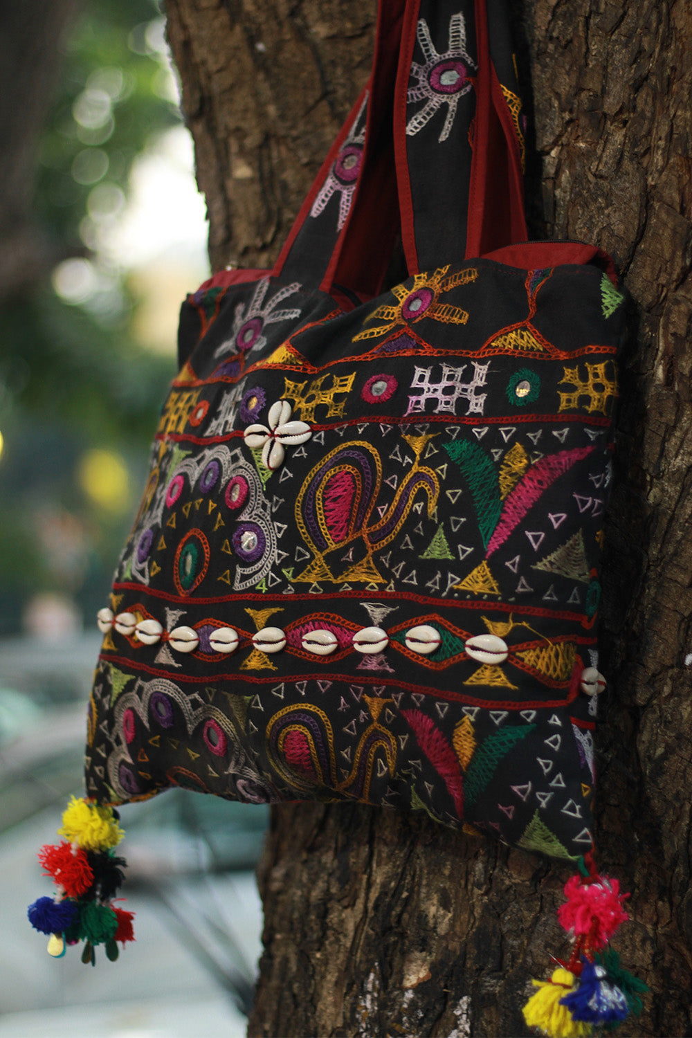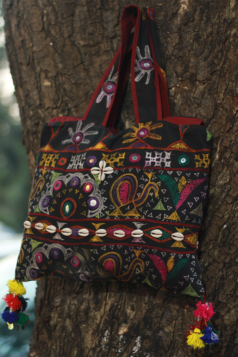 Each one is adorned with vibrant mirror work, detailed Banjara embroidery, and decorative shells, creating a rich, textured look that stands out effortlessly, reflecting the cultural artistry of the Banjara community, known for their bold and expressive textile work.