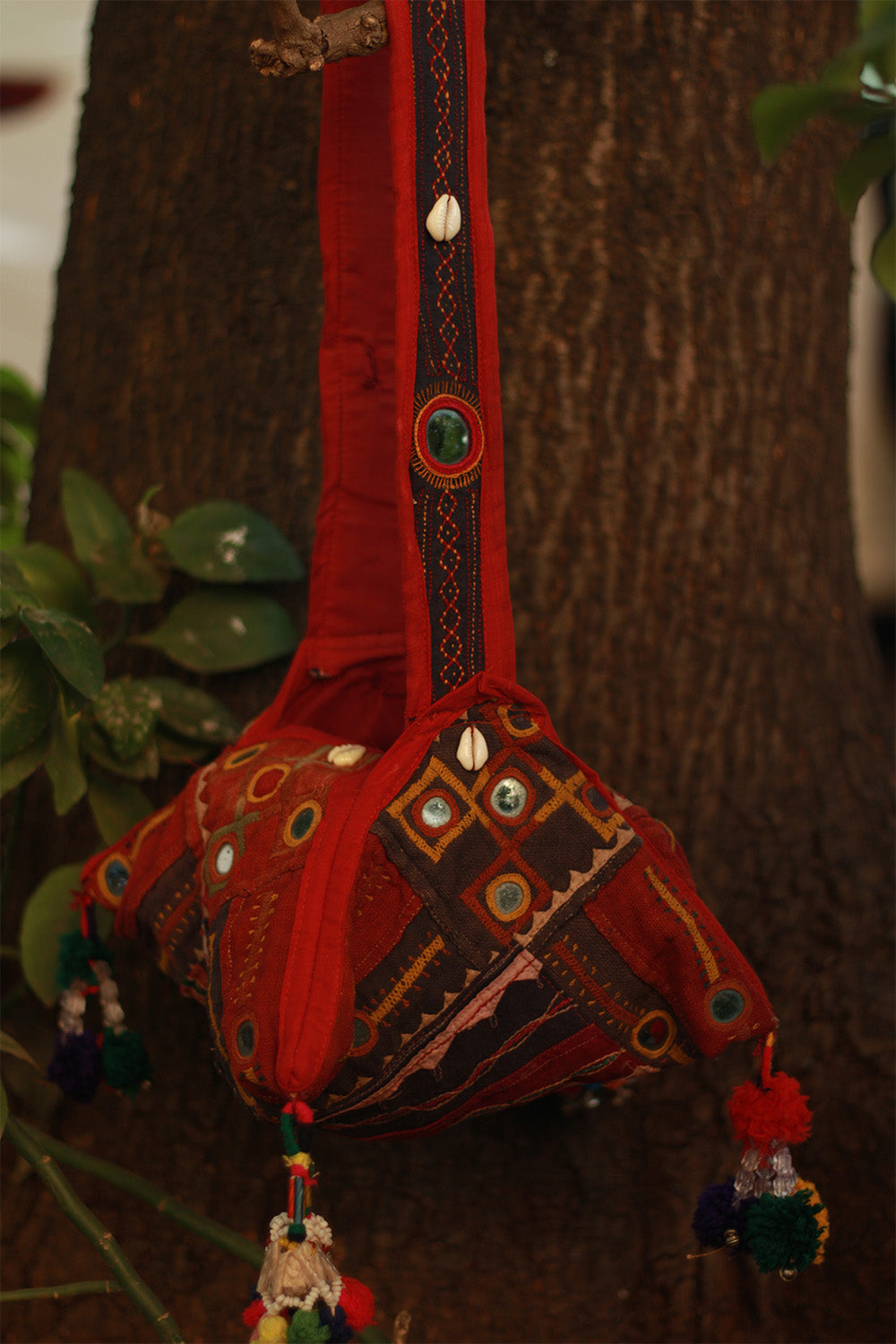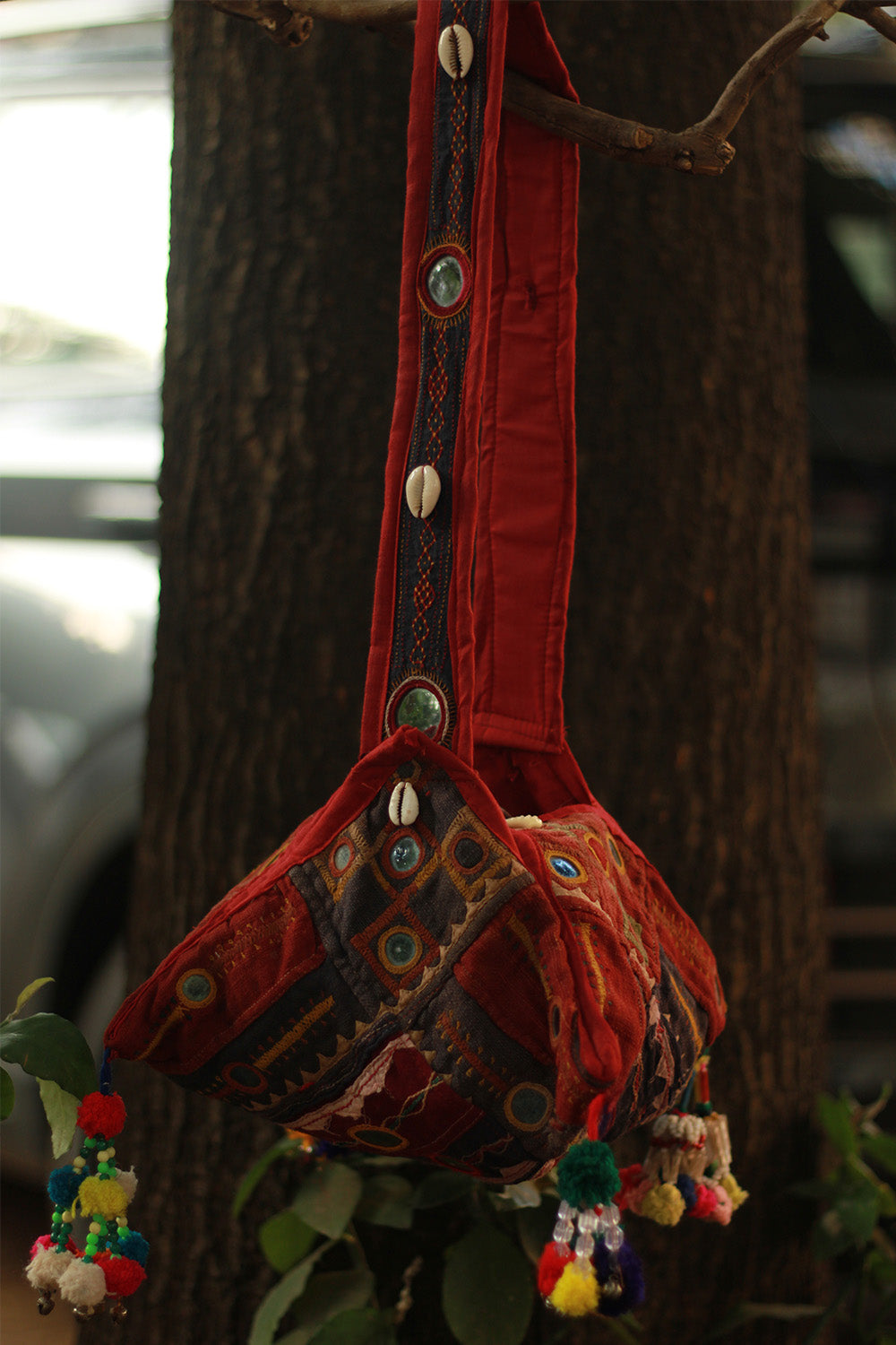 Each one is adorned with vibrant mirror work, detailed Banjara embroidery, and decorative shells, creating a rich, textured look that stands out effortlessly, reflecting the cultural artistry of the Banjara community, known for their bold and expressive textile work.