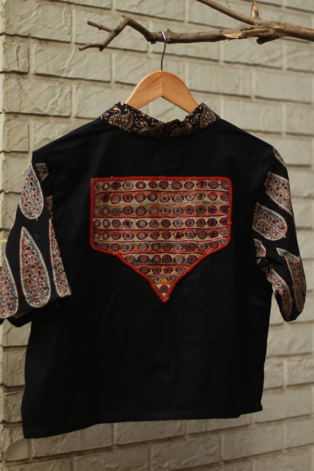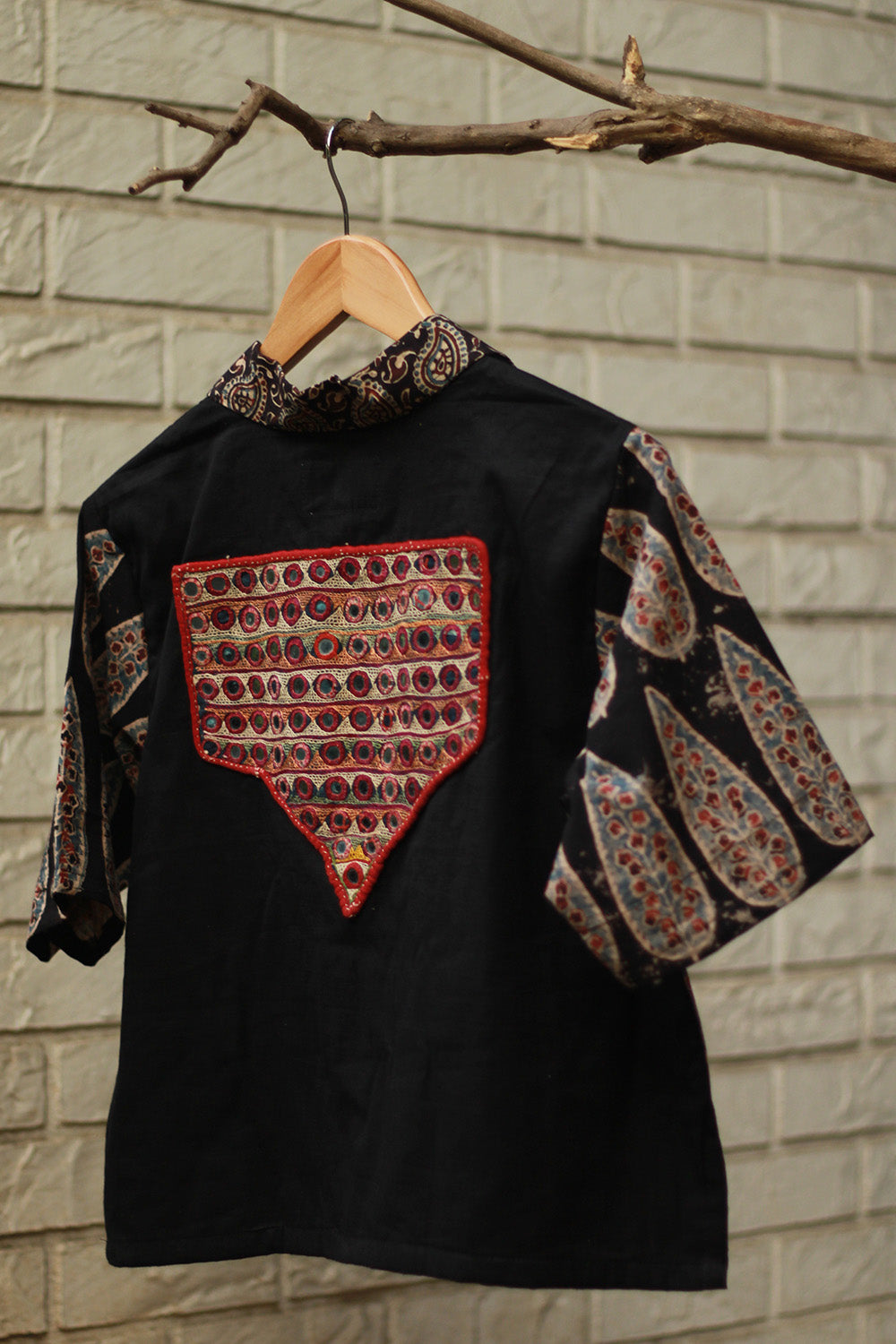 Embrace tradition, style, and elegance with this one-of-a-kind shirt. This striking piece combines the timeless art of Ajrakh block printing with the dazzling allure of mirrorwork embroidery, offering a unique and elegant addition to your wardrobe. Each shirt features vibrant, earthy tones and intricate patterns that reflect the rich cultural heritage of Gujarat.