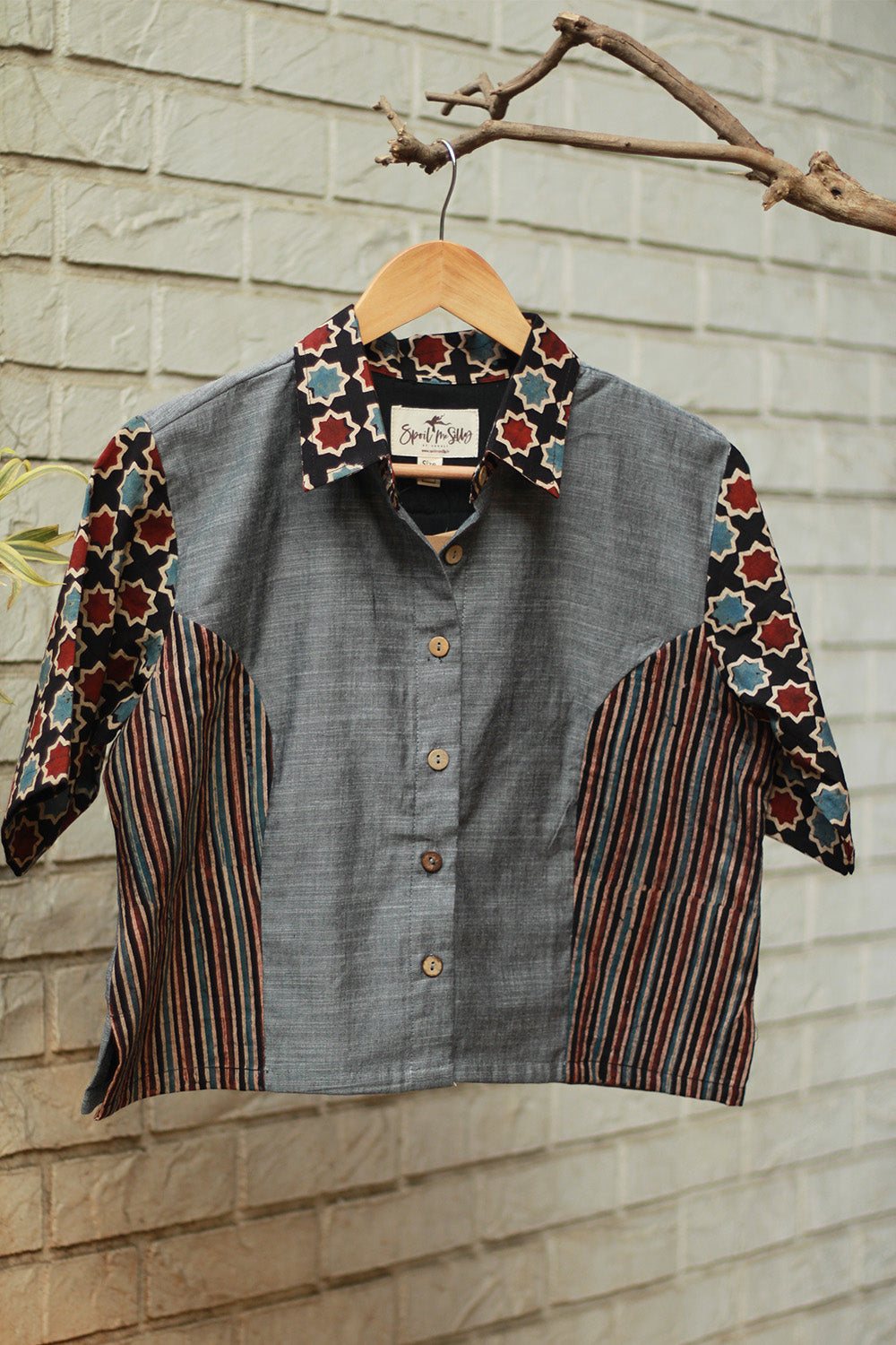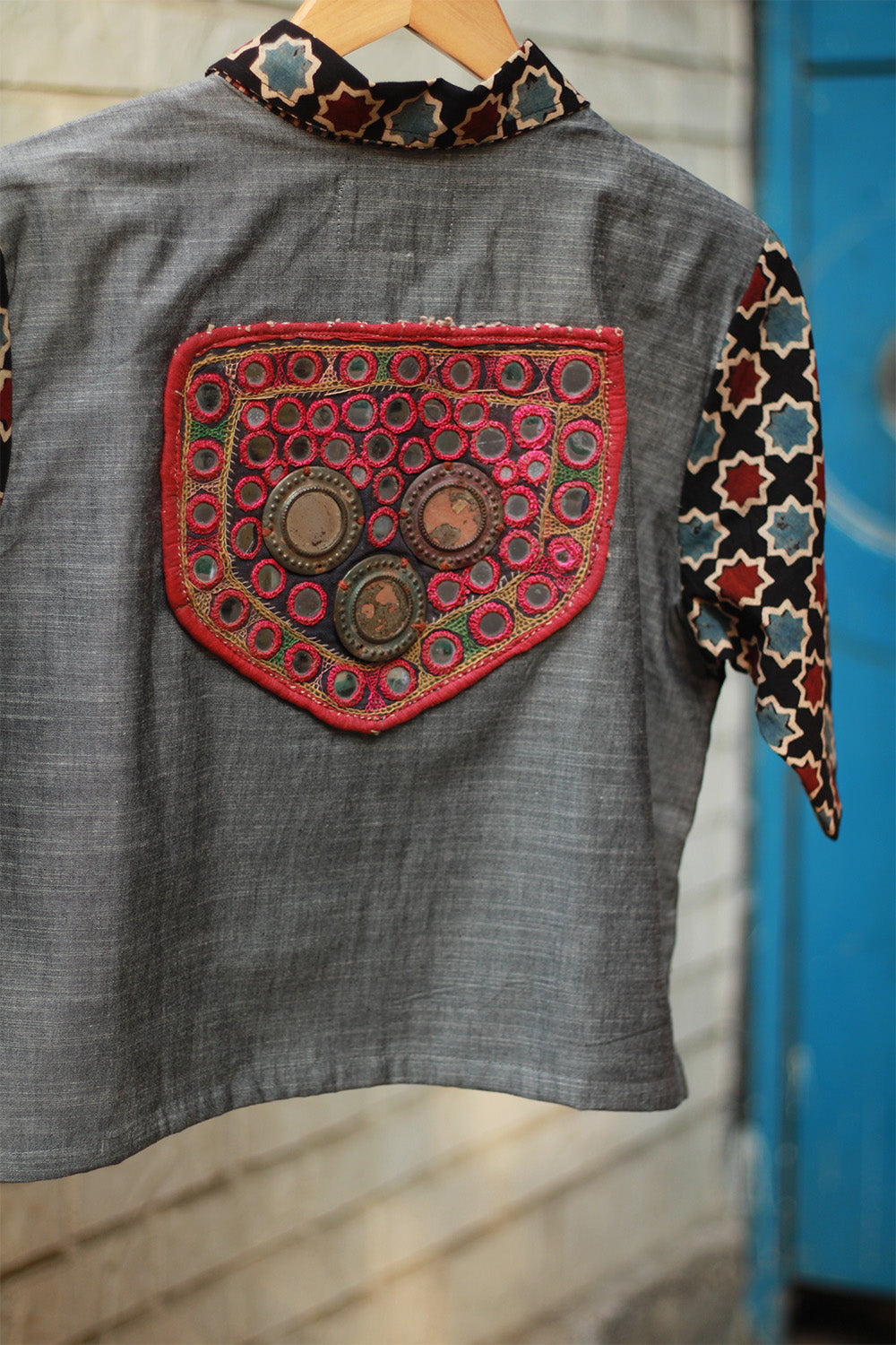 Embrace tradition, style, and elegance with this one-of-a-kind shirt. This striking piece combines the timeless art of Ajrakh block printing with the dazzling allure of mirrorwork embroidery, offering a unique and elegant addition to your wardrobe. Each shirt features vibrant, earthy tones and intricate patterns that reflect the rich cultural heritage of Gujarat.