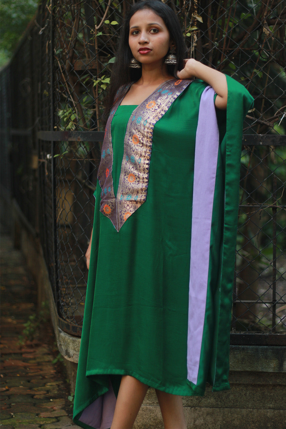 Effortless and majestic, this Modal Silk Kaftan brings you a soft shimmer, a whisper of air, and a bold spirit—made radiant with the sparkle of Banarasi craftsmanship and the cultural richness of a timeless silhouette.