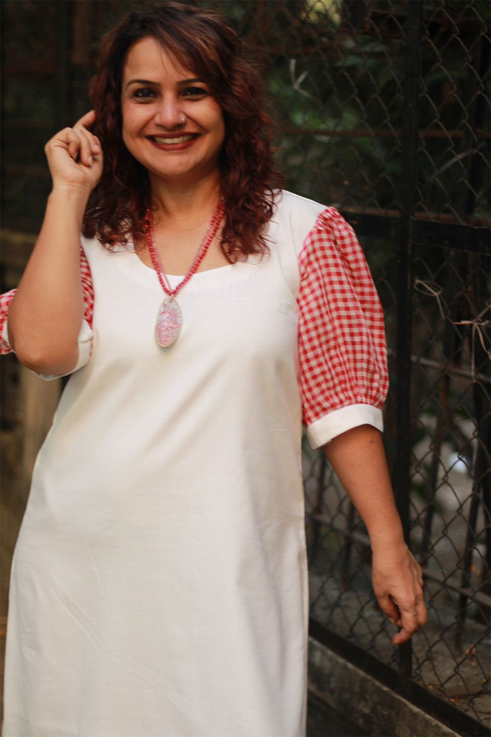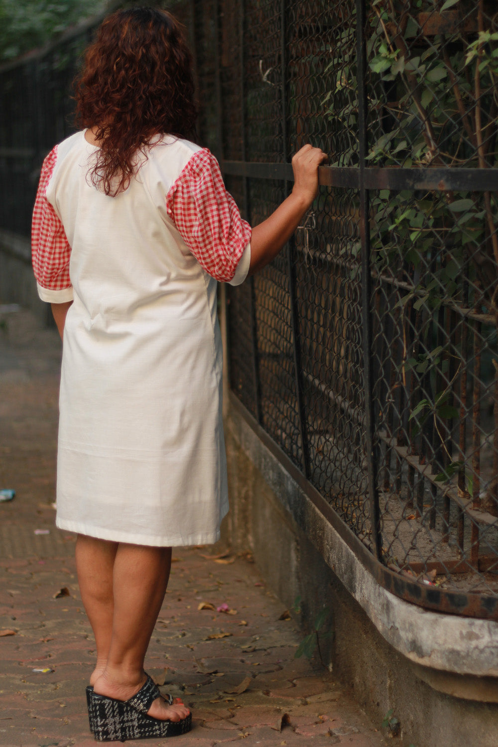 Introducing Snow White, a festive Christmas classic with a playful twist. Crafted in breathable cotton, this dress features a crisp white body paired with charming red and white checkered sleeves that instantly evoke the warmth and joy of the holiday season. The soft mul cotton sleeves add gentle volume and an airy, comfortable feel, making it ideal for cozy Christmas days.