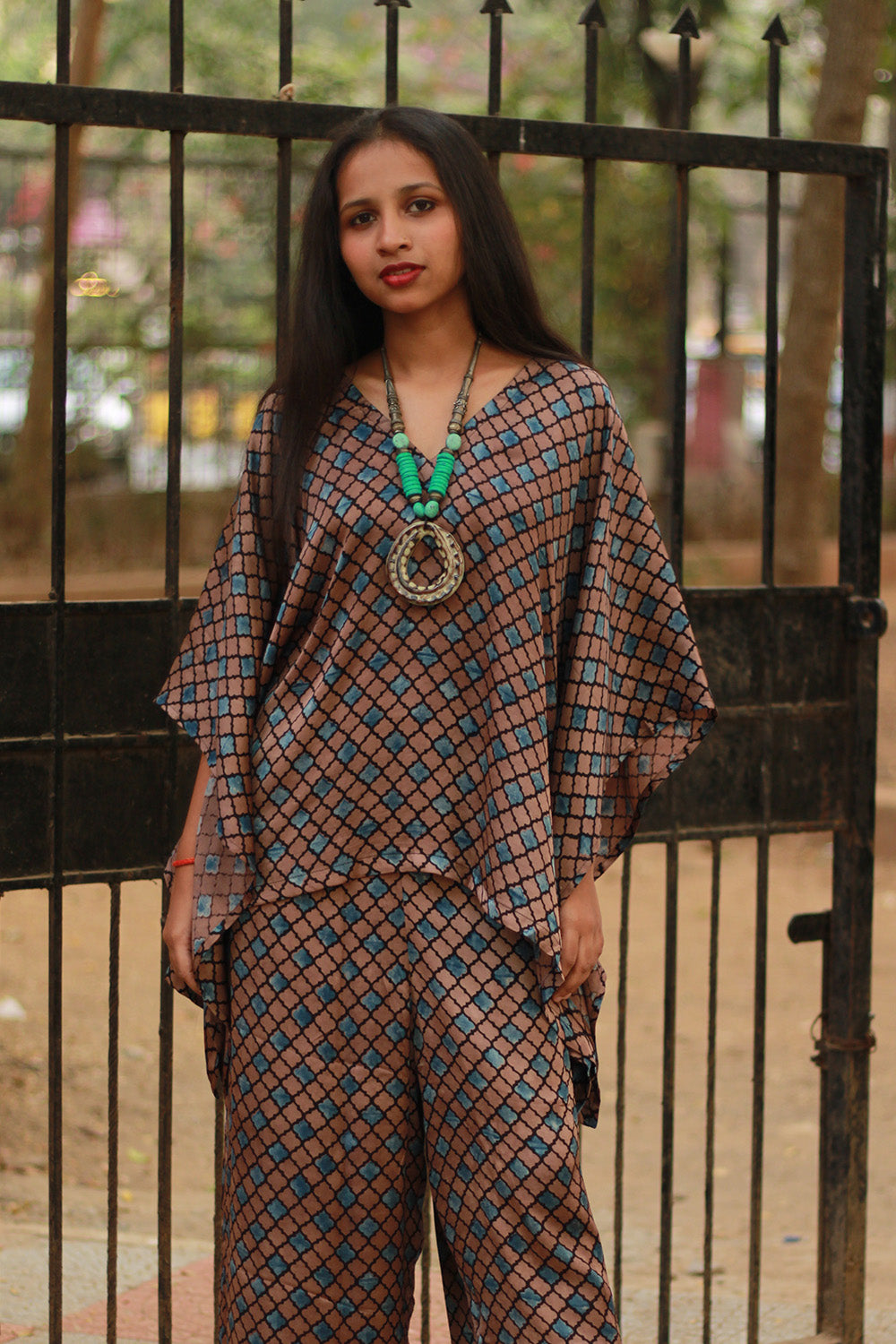 Step into sophistication with Taarini- our Kaftan tops crafted from luxurious Modal Silk, exuding elegance and comfort. Fashioned from mesmerizing blockprinted Ajrakh or Vanaspati motifs, each top tells a story of tradition and artistry. The satiny texture drapes gracefully, enhancing your silhouette with effortless allure. Perfect for an evening out, these tops blend cultural heritage with contemporary flair, making a statement wherever you go.