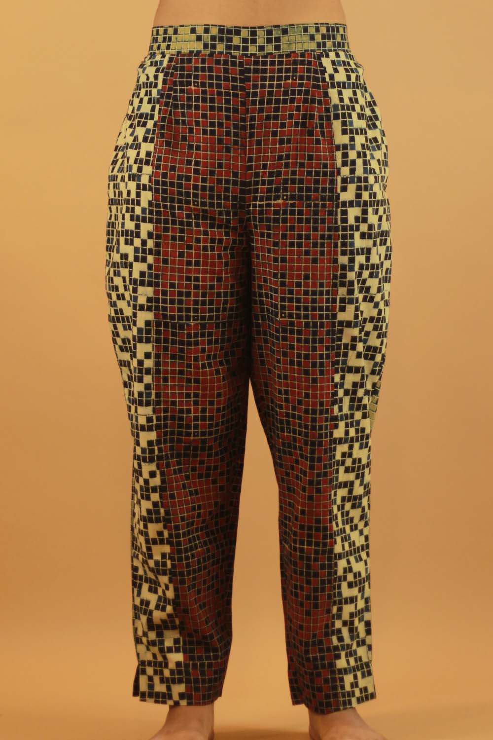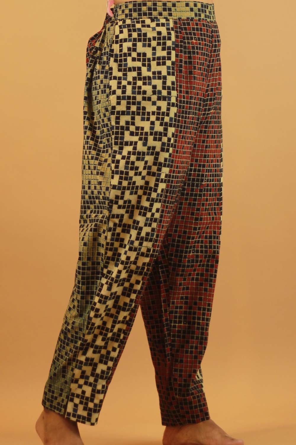 Versatility is at the core of these pants, as they effortlessly pair with a variety of tops, shirts, and kurtas, making them suitable for any occasion. This unique piece is made by combining complimentary Ajrakh patterns to set you apart in the crowd.