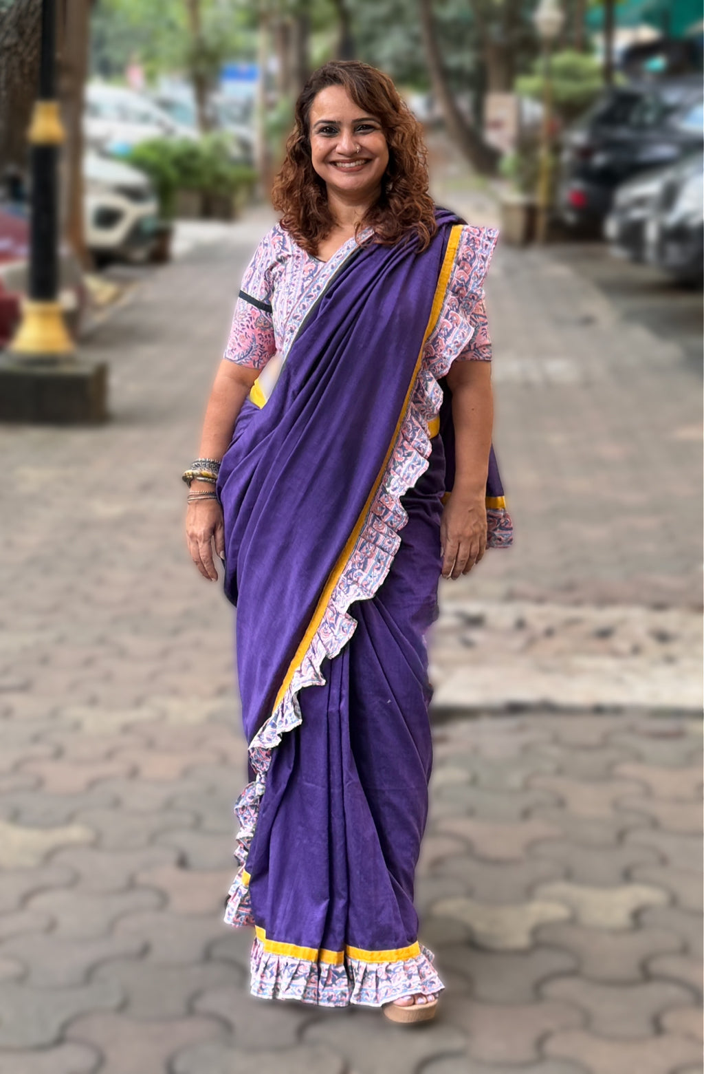 A serene canvas kissed by color — Hulchul pairs a plain, flowing saree with bursts of joy along the edges. The bright Sanganeri ruffles breathe life into simplicity, adding a touch of whimsy and movement without overwhelming its grace.
