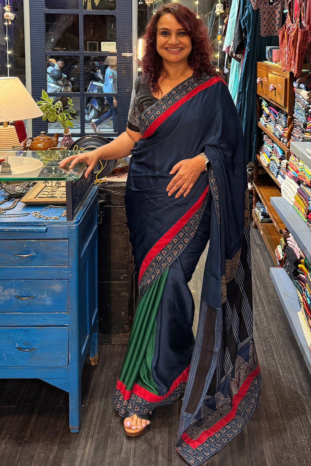 Step into a world of timeless elegance with this exquisite Modal Silk Saree, featuring intricate vintage Banarasi Zari borders and stunning Ajrakh prints. The luxurious feel of the fabric combined with the craftsmanship of Banarasi Zari creates a rich, regal look, while the traditional Ajrakh designs add a unique, cultural touch.