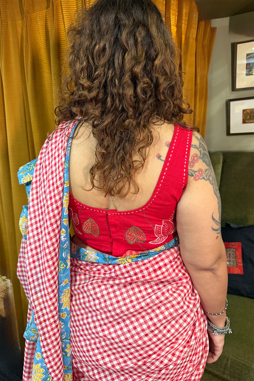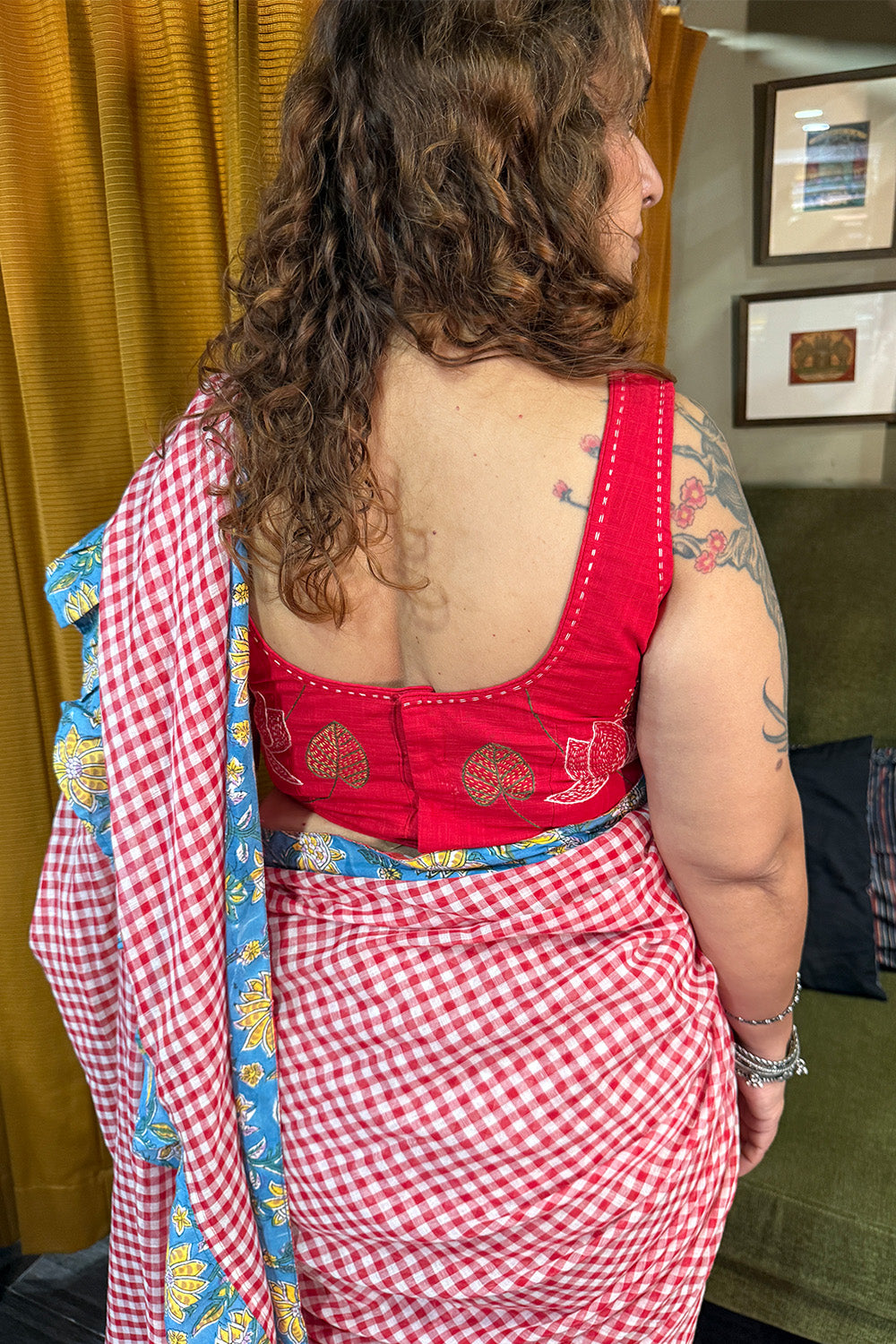 A serene canvas kissed by color — Hulchul pairs a plain, flowing saree with bursts of joy along the edges. The bright Sanganeri ruffles breathe life into simplicity, adding a touch of whimsy and movement without overwhelming its grace.